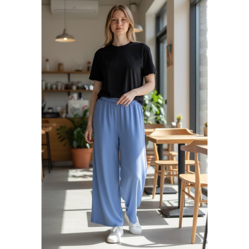 Zamonaviy va qulay palazzo shimlar — har kunlik kiyish, sayr va dam olish uchun ajoyib tanlov. Erkin fason qomatga chiroyli tushadi, oyoqlarni uzunroq ko‘rsatadi va qulaylik beradi. Rezinkali hamda bog‘ichli bel qismi oson moslanadi. Yengil va yoqimli mato issiq ob-havo uchun mos.